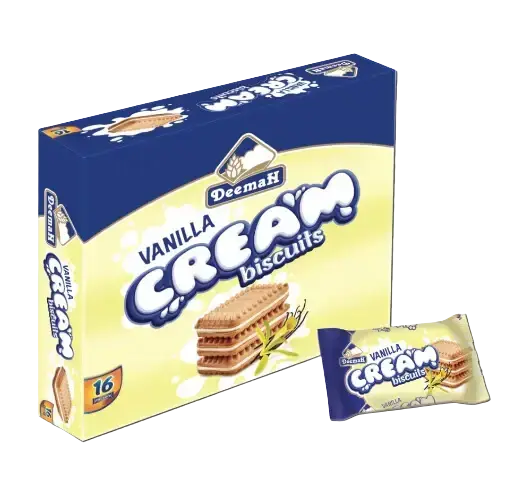 Deemah Vanilla Biscuit Cream 16 x 27g offers a deliciously crisp biscuit filled with smooth vanilla cream.