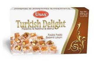 Usas Turkish Delight Pistachio, Hazelnut & Walnut, chewy sweet cubes loaded with a mix of pistachios, hazelnuts, and walnuts for a rich, crunchy texture. A nutty, satisfying dessert perfect for sharing or indulging.